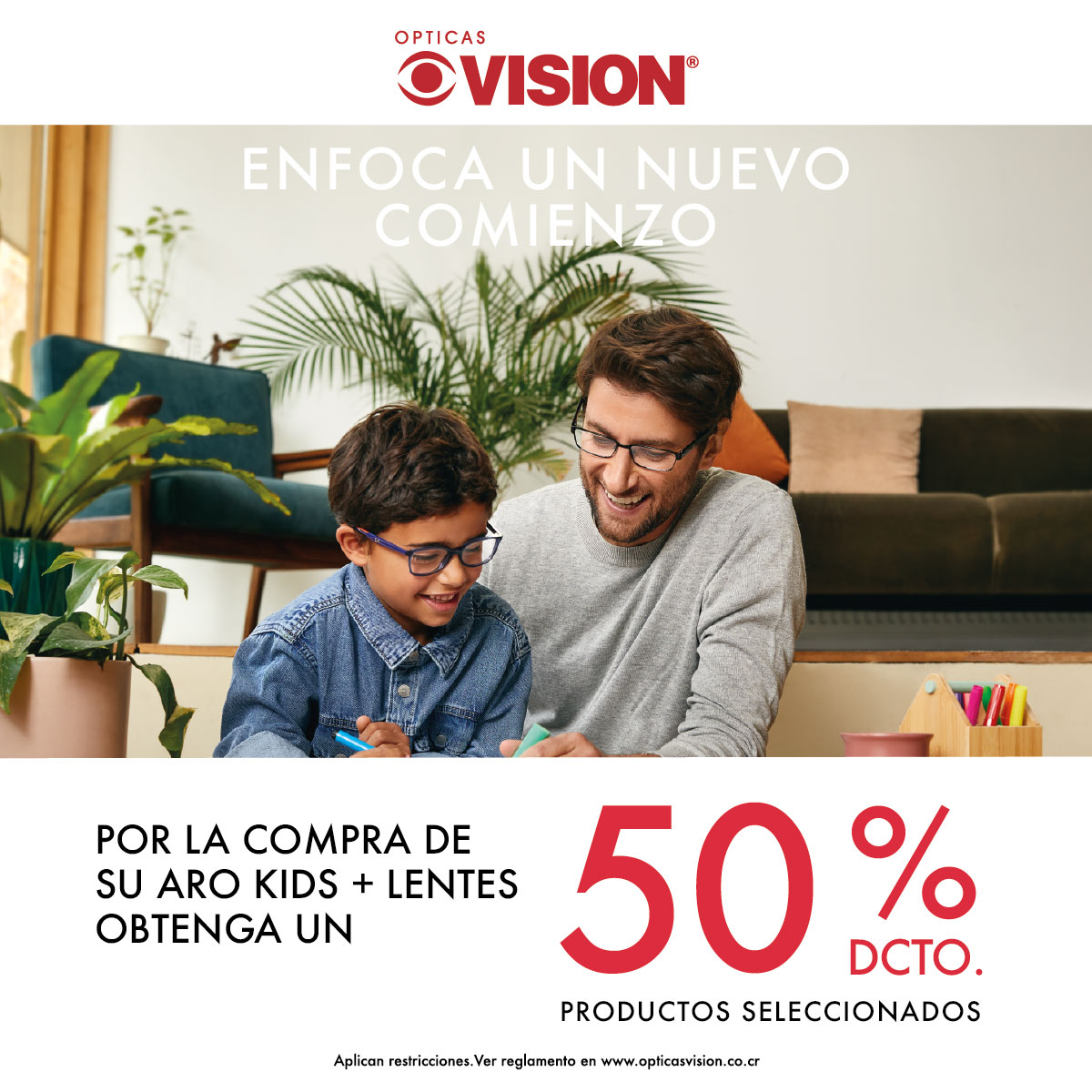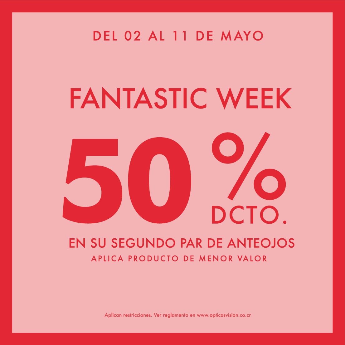Obtenga un 50% de descuento sobre precio regular en la compra de la segunda unidad “ARO CON LENTES + ANTEOJO DE SOL”, “ARO CON LENTES + ARO CON LENTES”, “ANTEOJOS DE SOL + ANTEOJOS DE SOL”. Descuento válido para producto de menor valor. Descuento no aplica en líquidos y/o accesorios. Descuento vigente por 15 días para hacer efectivo el canje del cupón. Descuento no acumulable con otras promociones y/o descuentos. Promoción válida del 15 al 29 de setiembre de 2025 en tiendas físicas y www.opticasvision.co.cr