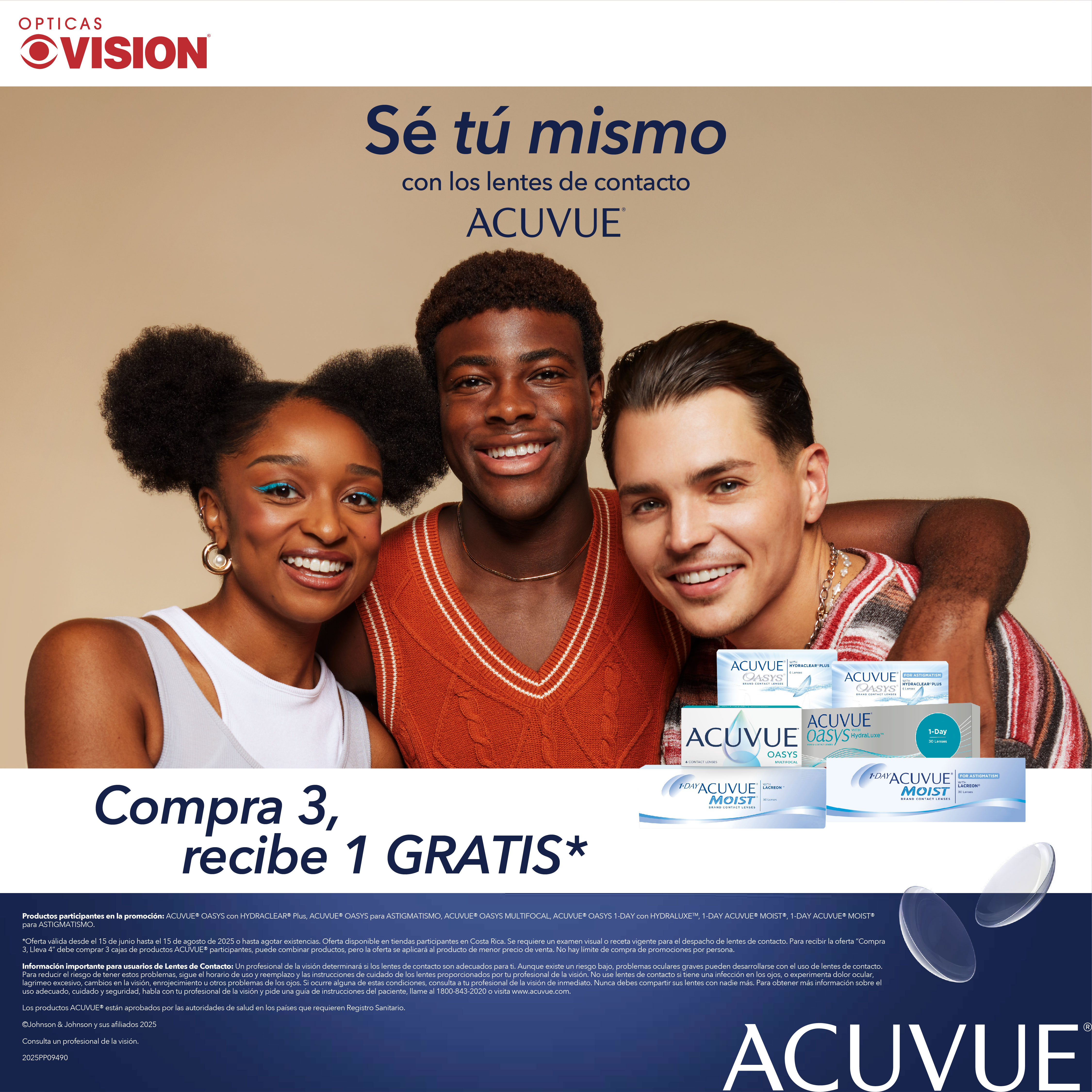 Oferta válida desde el 15 de junio hasta el 31 de agosto de 2025 o hasta agotar existencias. Oferta disponible en tiendas Ópticas Visión Costa Rica. Se requiere un examen visual o receta vigente para el despacho de lentes de contacto. Para recibir la oferta “Compra 3, Lleva 4” debe comprar 3 cajas de productos ACUVUE® participantes, puede combinar productos, pero la oferta se aplicará al producto de menor precio de venta. No hay límite de compra de promociones por persona.
