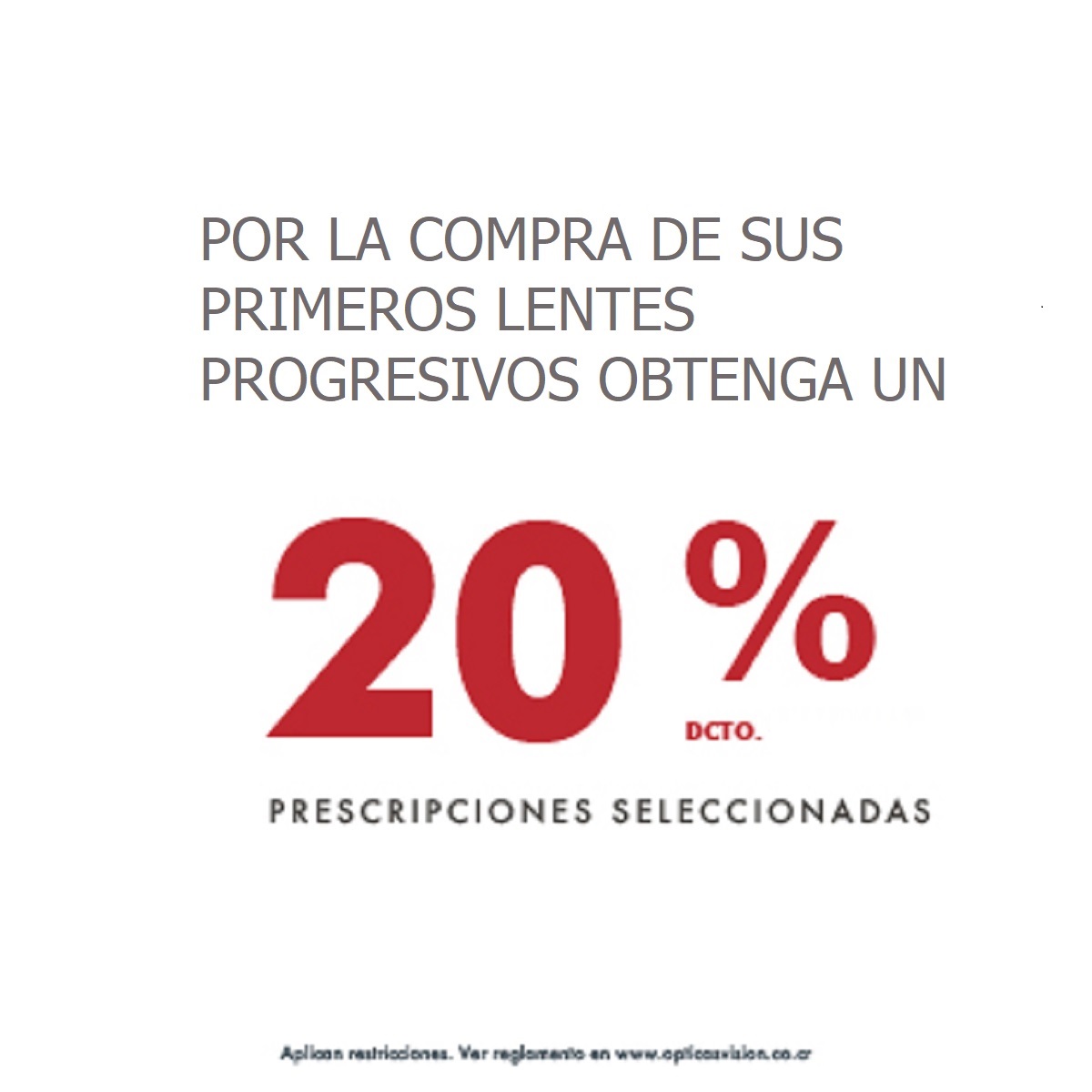 Obtenga un 20% de descuento en la compra de sus primeros lentes Progresivos. Descuento aplica para lentes con Adición de menor o igual a 1.50 en ambos ojos. Descuento NO aplica en aros. Descuento no aplica en líquidos y/o accesorios. Descuento no acumulable con otras promociones, convenios y/o descuentos. Promoción válida hasta diciembre 2025 en tiendas físicas y www.opticasvision.co.cr