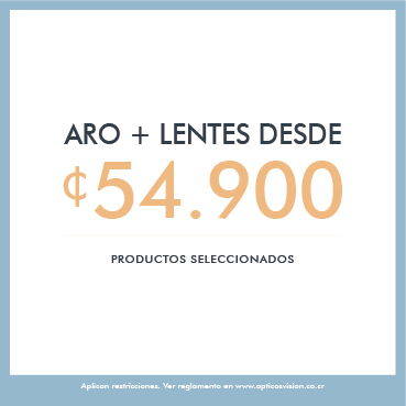 Cupón válido desde el 20 al 30 de marzo de 2025 en sucursales y tienda en línea. Obtenga un 25% de descuento por la compra de aro + lentes . Descuento no aplica para anteojos de sol, lentes de contacto, líquidos y/o accesorios. Descuento no acumulable con otras promociones y/o descuentos. En el Sitio Web solo aplica el descuento para el aro. El Cupón de descuento es intransferible y en caso de ser robado o perdido no será reemplazado por uno nuevo. Para compras presenciales deberás exhibir el Cupón previo al pago. Para compras en el sitio web deberás ingresar el Cupón como Código de descuento en los métodos de pago. ver reglamento en www.opticasvision.co.cr