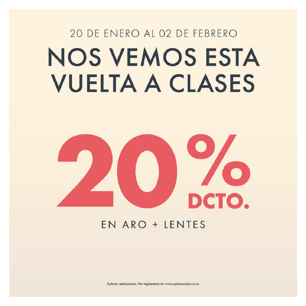 Promoción válida desde el 20 de Enero al 2 de Febrero de 2025. Por la compra de su "aro+ lentes ", obtenga un 20% de descuento en la compra total. Promoción válida sólo para compra "aro + lente". No aplica descuento en lentes de contacto o accesorios. No es acumulable con otras promociones o convenios. . Promoción válida en tiendas ver reglamento en www.opticasvision.co.cr