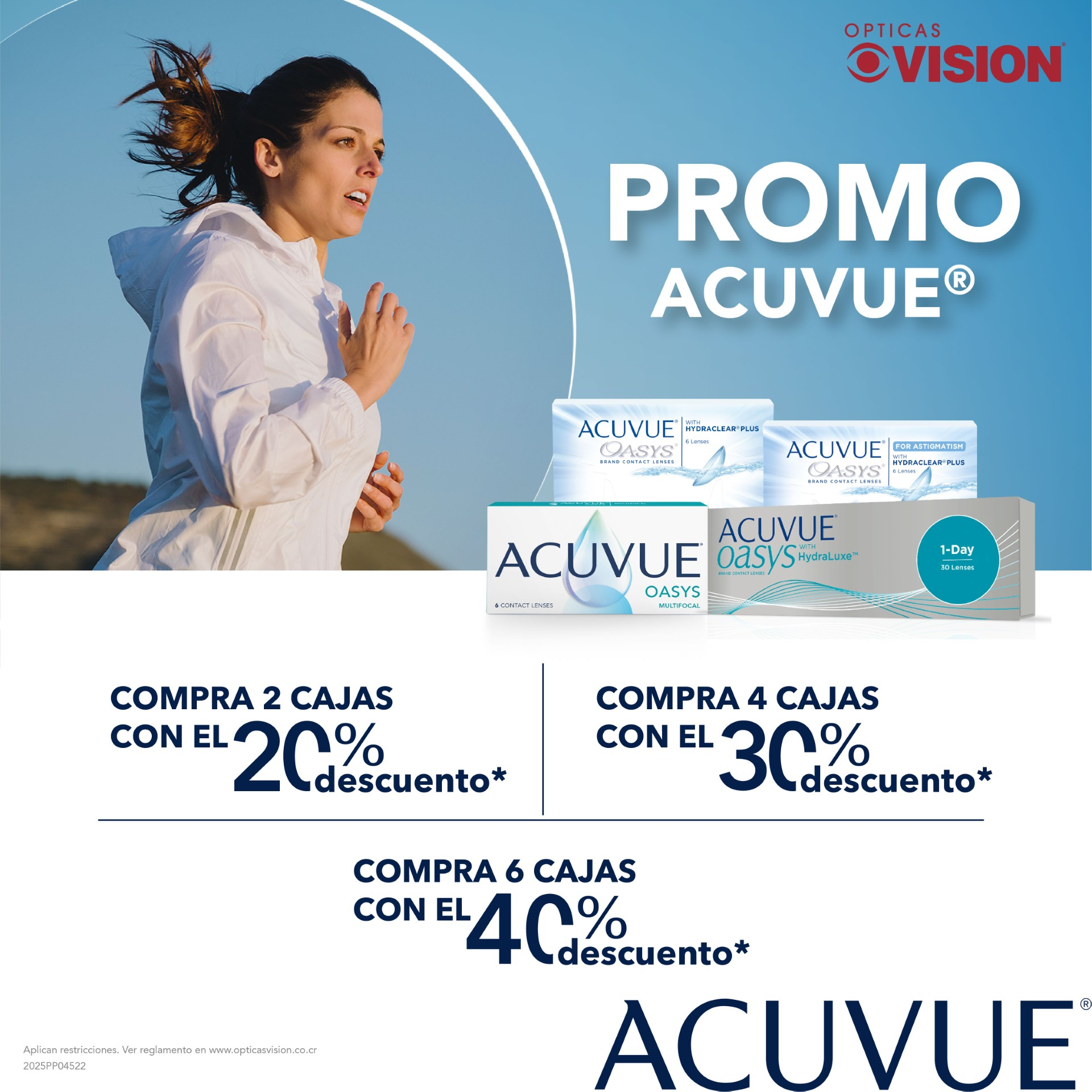 Obtenga un 15% de descuento por la compra mínima de 2 cajas de Lentes de Contacto u obtenga un 30% de descuento por la compra de mínima de 4 cajas de Lentes de Contacto en las marcas participantes en la promoción ACUVUE® OASYS con HYDRACLEAR® Plus, ACUVUE® OASYS para ASTIGMATISMO, ACUVUE® OASYS MULTIFOCAL, ACUVUE® OASYS 1-DAY con HYDRALUXETM. Oferta válida desde el 01 de noviembre hasta el 31 de diciembre de 2025 o hasta agotar existencias. Oferta disponible en tiendas tanto física como en la tienda virtual en Costa Rica. Se requiere un examen visual o receta vigente para el despacho de lentes de contacto. (Se excluye de la promoción Acuvue 2) No hay límite de compra de promociones por persona. No aplica con ningún otro descuento o convenio. No aplica con líquidos y/o accesorios. Ver reglamento en www.opticasvision.co.cr